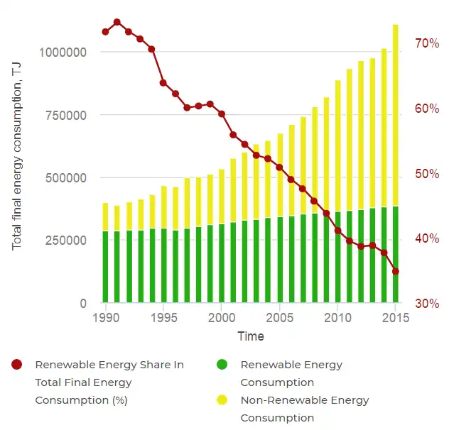 The supply of population and industry with modern energy is very low compared to countries with similar economies. The per-capita production of commercial energy increased since 2010 to 371kWh, but is still one of the lowest in the world.