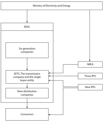 The current Egyptian electricity market is completely composed of governmental owned utilities, which can be divided into: 6 for generation, 1 for transmission and 9 for distribution[23], which all are operating under the direct management of the EEHC, as shown in the following figure (Fig.20)[23].