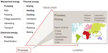 In terms of value chain processes, potential for optimized energy use are particularly to be found in irrigation, drying, cooling, storage, and packaging mills. The example of drying shows that a deeper analysis on this topic can connect numerous value chains and target countries.