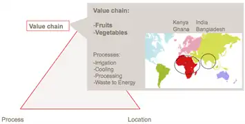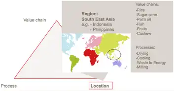Especially, the following value chains offer optimization potentials: rice, tea, vegetables /fruits, cocoa, coffee, palm oil, cashew, forestry, fish. The example of the fruits and vegetable value chains shows evidently that in addition to the above listed irrigation, also cooling, processing and energetic use of waste materials offer energy saving potentials.