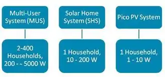 All systems include one or more solar modules of different sizes and various appliances. Frequently used categories are multi-user systems (MUSs) or PV mini-grids, solar home systems (SHSs) and PicoPV systems.