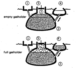 Fixed dome plant Nicarao design: 1.Mixing tank with inlet pipe and sand trap. 2.Digester. 3.Compensation and removal tank. 4.Gasholder. 5.Gaspipe. 6.Entry hatch, with gastight seal. 7.Accumulation of thick sludge. 8.Outlet pipe. 9.Reference level. 10.Supernatant scum, broken up by varying level. |
