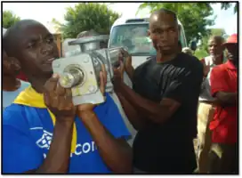 figura 5: Técnicos do NEER oferecendo bomba de água na comunidade de maqueze-Gaza.