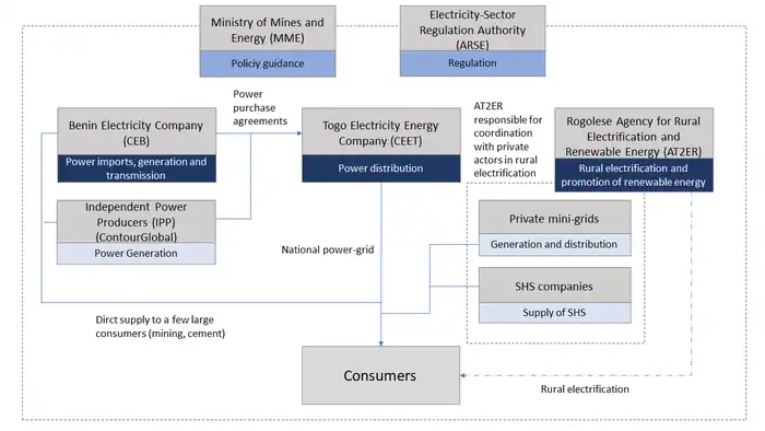 Another important player in the energy sector is the Togolese Agency for Rural Electrification and Renewable Energies (AT2ER), a public institution, with financial autonomy. The agency is in charge of implementing the country's rural electrification policy, promoting and developing renewable energies. As a central player dedicated to the development of renewable resources, AT2ER aims to transform the country's natural energy potential into electrical energy for the development of rural localities. Thus, AT2ER has the double responsibility of accelerating rural electrification and increasing the share of renewable energy in Togo's energy mix. Henceforth, any intervention with the aim of guaranteeing electricity supply to rural populations is ensured by the agency. In order to realize their plans, AT2ER directly supports private and independent companies that take care of the distribution of SHS systems or plan and install mini-grid systems.[22]