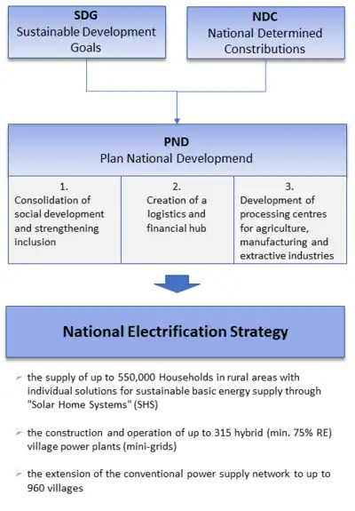 The energy sector is centrally anchored in the National Plan for Sustainable Development 2018-2022 (Plan national de développement, PND). The rural electrification sector is directly anchored in the third axis of the PND (consolidation of social development and strengthening inclusion). However, the first and second axes of the plan (establishment of a logistics and financial hub; development of processing centers for agriculture, manufacturing and extractive industries) also make direct reference to the energy sector as a transversal basis for sustainable economic development. The national electrification strategy adopted in June 2018 details the objectives of the PND. Togo's energy policy goal, as set out in the strategy, is to ensure access to environmentally friendly and competitive energy for the entire population by 2030. There is also fundamental coherence with Sustainable Development Goal (SDG).