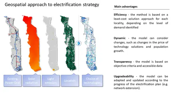 The national strategy is based on the most cost-effective approach for identify the technologies to be deployed on the territory. A geospatial model was designed based on digital cartography in order to obtain an overview of the demand for electricity and the possibilities for technical implementation. The result was a comprehensive Database indicating the least-cost electrification solution for each settlement in Togo.