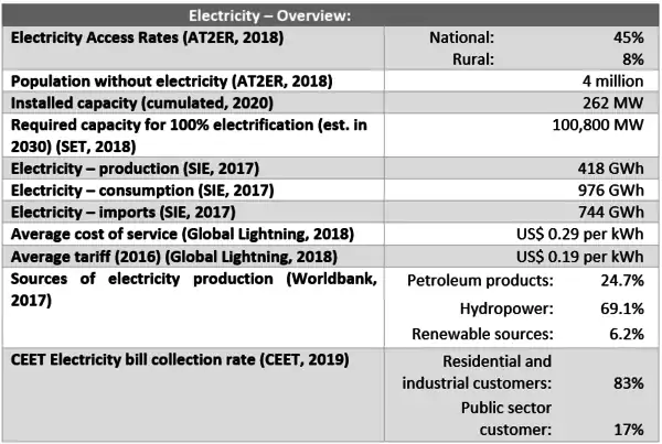 Currently, an electrical power of 230,000 kW is produced in the country. It is estimated that in 2030 a total of 100,800,000kW of electricity will have to be produced to supply the entire population with electricity.[9] [10]