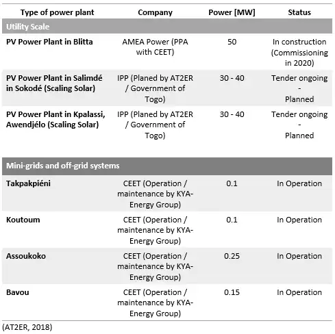 Utility scale: The first large photovoltaic solar power plant with a total capacity of 50 MW will be built in the town of Blitta by the end of October 2020. The project will be implemented in two phases: the first phase of 30 MW, which will be commissioned at the end of June 2020, and the second phase of 20 MW, which will follow at the end of October 2020. The plant is to improve the quality of the national electricity supply.[12]