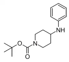 1-Boc-4-AP (tert-butyl 4-(phenylamino)piperidine-1-carboxylate) is a compound used as an intermediate in the manufacture of fentanyl, as well as various related derivatives such as butyrylfentanyl, furanylfentanyl, benzylfentanyl and homofentanyl, among others. It is an N-protected derivative of 4-anilinopiperidine which can be readily converted to fentanyl or related analogues in several straightforward synthetic steps. It was classified as a DEA List 1 Chemical in 2022, and is also controlled in various other jurisdictions. Its possession, sale and importation are consequently heavily regulated throughout much of the world.[1] 1-Boc-4-AP has also been identified as an impurity in other designer drug products, though it is unclear if it has any pharmacological activity in its own right.[2]