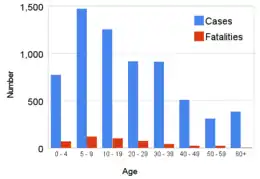 6,530 patients were admitted to hospitals with poisoning, and 459 deaths reported.[1] Cases reached a peak of hundreds per day in January, and had largely subsided by the beginning of March. The last admittance was on 27 March; admissions represented every age and gender stratum, although those under the age of ten represented a third of admitted cases. This number is "certainly an underestimate",[8] because of the availability of hospital treatment, hospital overcrowding and lack of faith in treatment. In the most severely affected areas, prevalence was 28% and mortality was 21% of the cases.[8] Some Iraqi doctors believe both the number of cases and fatalities are at least ten times too low,[6] with perhaps 100,000 cases of brain damage. One suggested reason for the vast discrepancy between reported and estimated numbers of deaths is the Iraqi custom, common to large parts of the Middle East, for a person to die at home when possible. Home deaths would not have been recorded.[9]