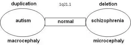 Statistical research showed that schizophrenia is significantly more common in combination with 1q21.1 deletion syndrome. On the other side, autism is significantly more common with 1q21.1 duplication syndrome. Similar observations were done for chromosome 16 on 16p11.2 (deletion: autism/duplication: schizophrenia), chromosome 22 on 22q11.21 (deletion (Velo-cardio-facial syndrome): schizophrenia/duplication: autism) and 22q13.3 (deletion (Phelan-McDermid syndrome): schizophrenia/duplication: autism). Further research confirmed that the odds on a relation between schizophrenia and deletions at 1q21.1, 3q29, 15q13.3, 22q11.21 en Neurexin 1 (NRXN1) and duplications at 16p11.2 are at 7.5% or higher.[4][5]