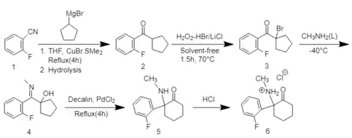 2-FDCK can be synthesized in a five-step reaction process.[1] First 2-fluorobenzonitrile reacts with the Grignard reagent cyclopentyl magnesium bromide followed by a bromination reaction to obtain α-bromocyclopentyl-(2-fluorophenyl)-ketone. The reaction of the obtained ketone with methylamine at -40 °C then results in the formation of α-hydroxycyclopentyl-(2-fluorophenyl)-N-methylamine. Finally, the five-membered ring cyclopentanol form is expanded to a cyclohexylketone form by a thermal rearrangement reaction. HCl is used to create a water-soluble HCl salt of 2-FDCK.