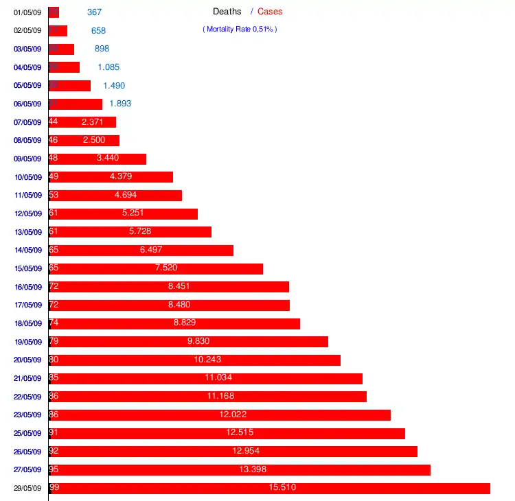 This is a table containing the figures from the WHO Influenza A Situation Updates issued in May 2009 roughly once a day.[1] Where more than one update was issued in a day, the corresponding figures are from the last update that day. The table can by sorted by country, date of first confirmed case or date of first confirmed case by continent.