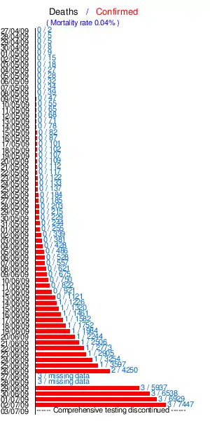 Until 2 July 2009 the HPA published daily reports[2] of laboratory-confirmed cases with breakdown by region, by age, and by source of infection (travel, community, etc.). From that date routine laboratory testing of all suspected cases and reporting of figures was discontinued. As of 8 July 2009 figures shown in this article are laboratory confirmed cases reported on 2 July.