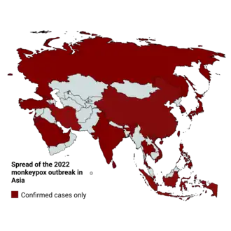 The 2022 mpox outbreak in Asia is a part of the ongoing outbreak of human mpox caused by the West African clade of the monkeypox virus. The outbreak was reported in Asia on 20 May 2022 when Israel reported a suspected case of mpox, which was confirmed on 21 May. As of 10 August 2022, seven West Asian, three Southeast Asian, three East Asian and one South Asian country, along with Russia, have reported confirmed cases.