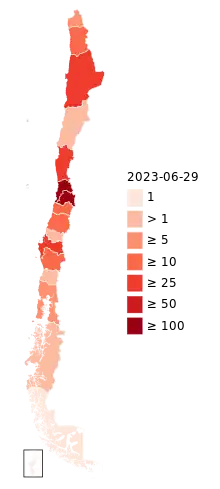 - 1 2 3 4 5 "Informe ejecutivo | Viruela del mono | Chile, 30 de junio de 2023" [Executive report | Mpox | Chile, June 30, 2023] (PDF). Department of Epidemiology (in Spanish). July 11, 2023. Retrieved August 1, 2023.