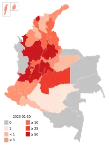 On July 8, the National Institute of Health confirmed a new case of the disease in Bogota from a person who had been in contact with an infected person from Italy when they had traveled to Europe.[22] On July 23, following the follow-up of several cases, health authorities began an extensive surveillance phase.[23] On the same day, the National Institute of Health confirmed that the number of cases in the country reached 10.[24] On July 25, the first case of a person who had been in Argentina was reported in the department of Cundinamarca, specifically in the municipality of Cajicá.[25] On July 29, the first case was detected in Pereira, capital of the department of Risaralda.[26] On July 30, the National Institute of Health confirmed the first case in the department of Valle del Cauca, specifically in the city of Cartago located in the north of the department.[27]