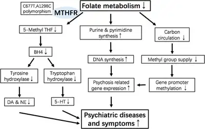 - 1 2 Wan, Lin; Li, Yuhong; Zhang, Zhengrong; Sun, Zuoli; He, Yi; Li, Rena (5 November 2018). "Methylenetetrahydrofolate reductase and psychiatric diseases". Translational Psychiatry. 8 (1): 1–12. doi:10.1038/s41398-018-0276-6. ISSN 2158-3188. Retrieved 30 September 2023.