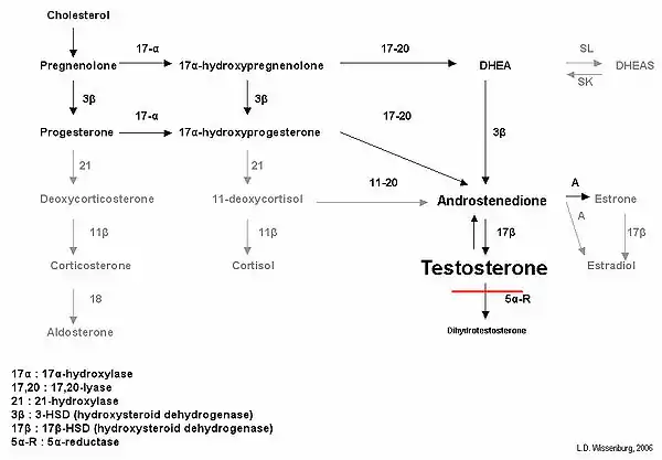 5α-Reductase type 2 (5αR2) is an enzyme, encoded by the SRD5A2 gene, that is expressed in specific tissues in the male body from fetal development to adulthood.[2][8][9] The enzyme catalyzes the transformation of testosterone (T) to 5α-dihydrotestosterone (DHT) intracellularly. DHT is the most potent ligand to the androgen receptor (AR).[10] Upon binding, the DHT-AR complex translocates from cytoplasm to the nucleus and activates the androgen receptor-regulated genes involved in processes that include male sexual differentiation.[11]
