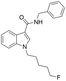 - ↑ Banister SD, Stuart J, Kevin RC, Edington A, Longworth M, Wilkinson SM, et al. (August 2015). "Effects of bioisosteric fluorine in synthetic cannabinoid designer drugs JWH-018, AM-2201, UR-144, XLR-11, PB-22, 5F-PB-22, APICA, and STS-135". ACS Chemical Neuroscience. 6 (8): 1445–58. doi:10.1021/acschemneuro.5b00107. PMID 25921407.