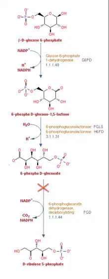 6-Phosphogluconate dehydrogenase deficiency (6PGD deficiency), or partial deficiency, is an autosomal hereditary disease characterized by abnormally low levels of 6-phosphogluconate dehydrogenase (6PGD), a metabolic enzyme involved in the Pentose phosphate pathway. It is very important in the metabolism of red blood cells (erythrocytes). 6PDG deficiency affects less than 1% of the population, and studies suggest that there may be race variant involved in many of the reported cases. Although it is similar, 6PDG deficiency is not linked to glucose-6-phosphate dehydrogenase (G6PD) deficiency, as they are located on different chromosomes. However, a few people have had both of these metabolic diseases.