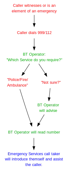 When 999 or 112 is dialled an operator will answer the call and ask, "Emergency. Which service?"[32] Previously operators asked "Which service do you require?" (approximately up to the mid-90s).