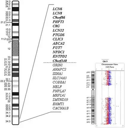 - ↑ Kleefstra, T; van Zelst-Stams, W A; Nillesen, W M; Cormier-Daire, V; Houge, G; Foulds, N; van Dooren, M; Willemsen, M H; Pfundt, R; Turner, A; Wilson, M; McGaughran, J; Rauch, A; Zenker, M; Adam, M P; Innes, M; Davies, C; Lopez, A G.-M.; Casalone, R; Weber, A; Brueton, L A; Navarro, A D.; Bralo, M P.; Venselaar, H; Stegmann, S P A; Yntema, H G; van Bokhoven, H; Brunner, H G (4 March 2009). "Further clinical and molecular delineation of the 9q subtelomeric deletion syndrome supports a major contribution of EHMT1 haploinsufficiency to the core phenotype". Journal of Medical Genetics. 46 (9): 598–606. doi:10.1136/jmg.2008.062950. PMC 3395372. PMID 19372089.