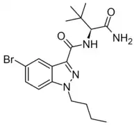 ADB-5'Br-BUTINACA (ADB-B-5Br-INACA) is an indazole-3-carboxamide based synthetic cannabinoid receptor agonist which has been sold as a designer drug,[1] first detected in Philadelphia in the US in May 2022,[2] and subsequently found in South Korea,[3] Portugal and Sweden.[4] It is specifically listed as an illegal drug in Italy,[5] South Korea[6] and several states in the US,[7][8] and controlled under analogue legislation in various other jurisdictions.