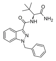 The analogue with a 1-butyl substitution on the indazole ring rather than 1-benzyl has also been sold as a designer drug under the name ADB-BINACA, but is now more commonly referred to as ADB-BUTINACA to avoid confusion with the benzyl compound.[4][5][6][7][8] It is a similarly potent CB1 agonist, with a binding affinity of 0.29nM for CB1 and 0.91nM for CB2, and an EC50 of 6.36 nM for CB1.[9][10]