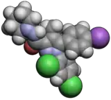 AM-251 is an inverse agonist at the CB1 cannabinoid receptor. AM-251 is structurally very close to rimonabant; both are biarylpyrazole cannabinoid receptor antagonists. In AM-251, the p-chloro group attached to the phenyl substituent at C-5 of the pyrazole ring is replaced with a p-iodo group. The resulting compound exhibits slightly better binding affinity for the CB1 receptor (with a Ki value of 7.5 nM) than rimonabant, which has a Ki value of 11.5 nM, AM-251 is, however, about two-fold more selective for the CB1 receptor when compared to rimonabant.[1] Like rimonabant, it is additionally a μ-opioid receptor antagonist[2] that attenuates analgesic effects.[3]