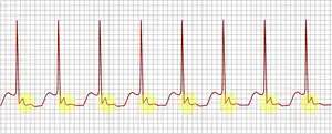 ECG tracing of typical AV nodal reentrant tachycardia. Highlighted in yellow is the P wave that falls after the QRS complex. | |