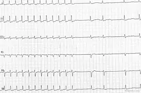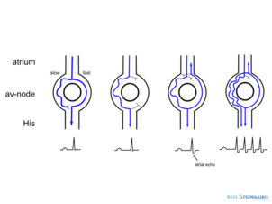It is generally not associated with underlying heart disease.[1] The underlying mechanism is believed to involve two pathways in the atrioventricular (AV) node that conduct at different speeds.[3] Diagnosis is supported by an electrocardiogram (ECG) showing a regular heart rate of 140 to 280 beats per minute and a narrow QRS complex.[1] The P waves are generally not visible as they occur within the QRS complex.[3]