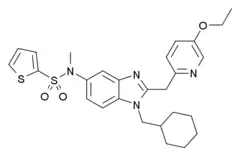 AZ-11713908 is a drug developed by AstraZeneca which is a peripherally selective cannabinoid agonist, acting as a potent agonist at the CB1 receptor and a partial agonist at CB2. It has poor blood–brain barrier penetration, and so while it is an effective analgesic in animal tests, it produces only peripheral effects at low doses, with much weaker symptoms of central effects compared to other cannabinoid drugs such as WIN 55,212-2.[1] Many related benzimidazole-derived cannabinoid ligands are known.[2][3][4][5]