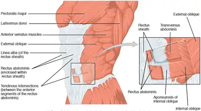 The linea alba is a white, fibrous band that is made of the bilateral rectus sheaths that join at the anterior midline of the body. These enclose the rectus abdominis muscles (a pair of long, linear muscles, commonly called the “sit-up” muscles) that originate at the pubic crest and pubic symphysis, and extend the length of the body’s trunk. Each muscle is segmented by three transverse bands of collagen fibers called the tendinous intersections. This results in the look of “six-pack abs,” as each segment hypertrophies on individuals at the gym who do many sit-ups.