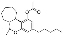 Abeo-HHC acetate is a semi-synthetic derivative of tetrahydrocannabinol, first described in the 1980s. It is synthesised from the acetate ester of delta-11-tetrahydrocannabinol, which can be made to undergo a ring expansion reaction via a hydrazone intermediate to form abeo-HHC acetate.[1][2] It is structurally similar to HHC-acetate except it's substituted with a cycloheptyl ring instead of a cyclohexyl ring.