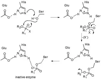 The irreversible phosphorylation of the cholinesterase occurs in two steps. In the first step the cholinesterase gets reversibly phosphorylated. This reaction is very fast. Then the second step takes place. The cholinesterase forms a very stable complex with TEPP, in which TEPP is covalently bound to the cholinesterase. This is a slow reaction. But after this step the cholinesterase is irreversibly inhibited.[6]
