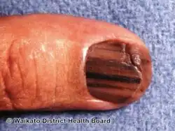 Acral lentiginous melanoma may present as a dark mark under a nail, or a black mark in the nail fold at the end of a dark streak.[1] There may be Hutchinson's sign.[1]