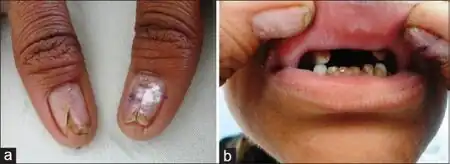 a)Dysplastic ridged nails with central splitting b)decayed incisors | |