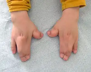 Acrocephalosyndactyly is a group of autosomal dominant congenital disorders characterized by craniofacial (craniosynostosis) and hand and foot (syndactyly) abnormalities.[1] When polydactyly is present, the classification is acrocephalopolysyndactyly.[2] Acrocephalosyndactyly is mainly diagnosed postnatally, although prenatal diagnosis is possible if the mutation is known to be within the family genome.[1] Treatment often involves surgery in early childhood to correct for craniosynostosis[3] and syndactyly.[4]