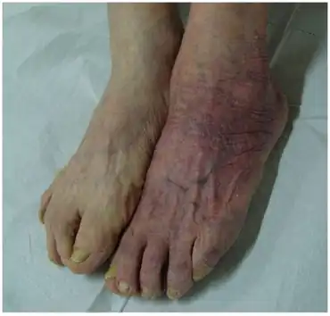 Symptoms | Bluish-red discolouration, thinning skin.[1] |