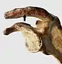 In modern turtles, the acromion projects ventrally and articulates with the plastron (the flat lower part of the shell), but it evolved independently in pareiasaurs and turtles long before the plastron.[10] In these primitive ancestors, the acromion projected forward to form a strong and flexible articulation between the shoulder girdle and the clavicle. Notwithstanding these changes, the acromion of turtles retains its original function, to support the shoulder girdle and increase stride length. [11]