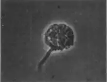 The shape of the sporangia takes on a more regular shape immediately before rupturing. The spores released are highly motile, taking on varying shapes of spherical and oval.