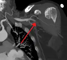 Acute occlusion of the axillary artery resulting in an ischemic limb as seen on CT angiography