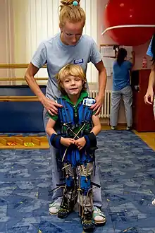 The ADELI Suit is derived from a suit originally designed for the Soviet space program in the late 1960s[1] that was first tested in 1971.[2] The purpose then was to give the cosmonauts in space a way to counter the effects of long-term weightlessness on the body. The ADELI Suit is currently used to treat children with physical disabilities resulting from cerebral palsy, other neurological conditions originating from brain damage or spinal cord injury.