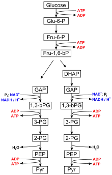 Steps 1 and 3 require the input of energy derived from the hydrolysis of ATP to ADP and Pi (inorganic phosphate), whereas steps 7 and 10 require the input of ADP, each yielding ATP.[7] The enzymes necessary to break down glucose are found in the cytoplasm, the viscous fluid that fills living cells, where the glycolytic reactions take place.[1]