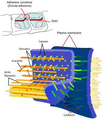 - α-catenin or alpha-catenin binds the cadherin indirectly via β-catenin or plakoglobin and links the actin cytoskeleton with cadherin. Significant protein dynamics are thought to be involved.[5]