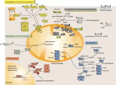The role of oxidative stress in ALD progression in spinal cord is already manifesting as early as 3.5 months of age. The picture shows dysregulated gene expression, induced (red triangle) and repressed (green triangle), of processes and components involved in ROS generation (black stars) and antioxidant defense (white stars). Perturbations in oxidative phosphorylation, iron and calcium homeostasis and changes in GSH homeostasis may altogether represent causes and consequences of increased oxidative stress. ROS might activate NF-κB leading to the regulation of genes involved in cell survival and inflammation. 12-Hydroxyeicosatetrenoate (12-HETE), arachidonate 12-lipoxygenase (ALOX12), ATPase, Ca2+ transporting, cardiac muscle, slow twitch 2 (ATP2A2), ATPase, Ca2+ transporting, plasma membrane 1 (ATP2B1), calcium-channel, voltage-dependent, alpha 2/delta subunit 3 (CACNA2D3), calcium-channel, voltage-dependent, gamma subunit 5 (CACNG5), calcium-channel, voltage-dependent, L-type, alpha 1D subunit (CACNA1D), calcium/calmodulin-dependent protein kinase (CaM kinase) II delta (CAMK2D), calmodulin 1 (CALM1), protein phosphatase 3, catalytic subunit, alpha isoform (PPP3CA), ceruloplasmin (CP), coenzyme Q10 (CQ), coproporphyrinogen oxidase (CPOX), cystathionine beta-synthase (CBS), cytochrome b-245 (CYBA), cytochrome c (CytC), DLST, dihydroxyacetone-phosphate (DHAP), electron transport chain complexes I:V (C-I:C-V), epoxide hydrolase 1, microsomal (EPHX1), glucose-6-phosphate dehydrogenase X-linked (G6PDH), GCLC, GRX, GSH, glutathione disulfide (GSSG), GPX, glutathione reductase (GSR), GST, GSS, glyceraldehyde-3-phosphate (G3P), glycerol-3-phosphate dehydrogenase (GPDH), glyoxalase 1 (GLO1), glyoxylate reductase/hydroxypyruvate reductase (GRHPR), nuclear factor of kappa light polypeptide gene enhancer in B-cells inhibitor alpha (NFKBIA or IκBα), conserved helix–loop–helix ubiquitous kinase (CHUK or IKKα), inhibitor of kappa light polypeptide gene enhancer in B-cells, kinase beta (IKBKB or IKKβ), inhibitor of kappa light polypeptide gene enhancer in B-cells, kinase gamma (IKBKG or IKKγ), lipid hydroperoxide (LOOH), lipid hydroxide (LOH), malic enzyme (ME), NADPH oxidase 1 (NOX1), nuclear factor of kappa light polypeptide gene enhancer in B-cells 1 and 2 (NF-κB1 and NF-κB2), OGDH, PRX, phosphodiesterase 1A, calmodulin-dependent (PDE1A), PGPX, phosphorylase kinase, alpha 1 (PHKA1), pyruvate dehydrogenase (PDH), solute carrier family 8 (sodium/calcium exchanger), member 1 (SLC8A1), thioredoxin (TRX), TCA, triosephosphate isomerase 1 (TPI), uncoupling protein 2 (UCP2), uroporphyrinogen decarboxylase (UROD), uroporphyrinogen III synthase (UROS).