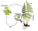 Pteridophytes are vascular plants that disperse spores, such as fern spores. Pteridophyte spores are similar to pollen grains and fungal spores, and are also components of aeroplankton.[68][69] Fungal spores usually rank first among bioaerosol constituents due to their count numbers which can reach to between 1,000 and 10,000 per cubic metre (28 and 283/cu ft), while pollen grains and fern spores can each reach to between 10 and 100 per cubic metre (0.28 and 2.83/cu ft).[49][70]