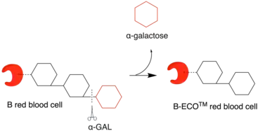 Red blood cell (RBC) surfaces are decorated with the glycoproteins and glycolipids that have the same basic sequence with terminal sugar α1‐2‐linked fucose linked to the penultimate galactose. This galactose molecule is called the H antigen.[25][26][27] Blood type A, B, AB, and O differ only in the sugar (red molecule in the illustration) linked with the penultimate galactose. For blood type B, this linked sugar is an α-1‐3‐linked galactose. Using α-GAL, this terminal galactose molecule can be removed, converting RBC to type O.