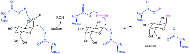 - ↑ Vocadlo DJ, Davies GJ (October 2008). "Mechanistic insights into glycosidase chemistry". Current Opinion in Chemical Biology. 12 (5): 539–55. doi:10.1016/j.cbpa.2008.05.010. PMID 18558099.